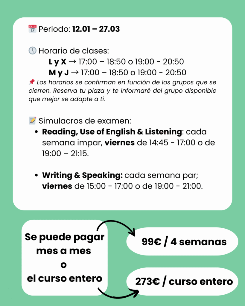 Además, tendrás acceso a vocabulario específico por temas, repasos de gramática clave de nivel C1, y estrategias útiles para afrontar cada tarea con seguridad. Cada semana recibirás tareas para reforzar lo aprendido y podrás repasar con apuntes y grabaciones de las clases.