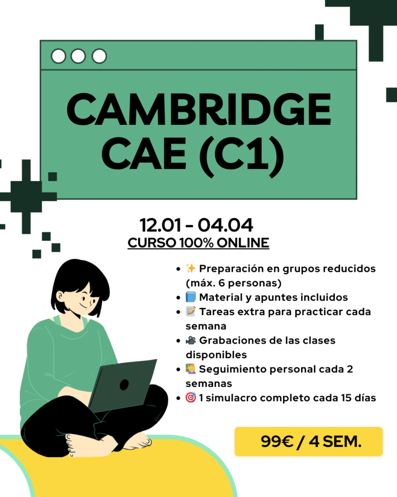 Aprueba el examen Cambridge CAE C1 con clases dinámicas, simulacros reales y materiales actualizados. Consigue tu certificado oficial C1 Cambridge de inglés de forma práctica, rápida y eficaz.
