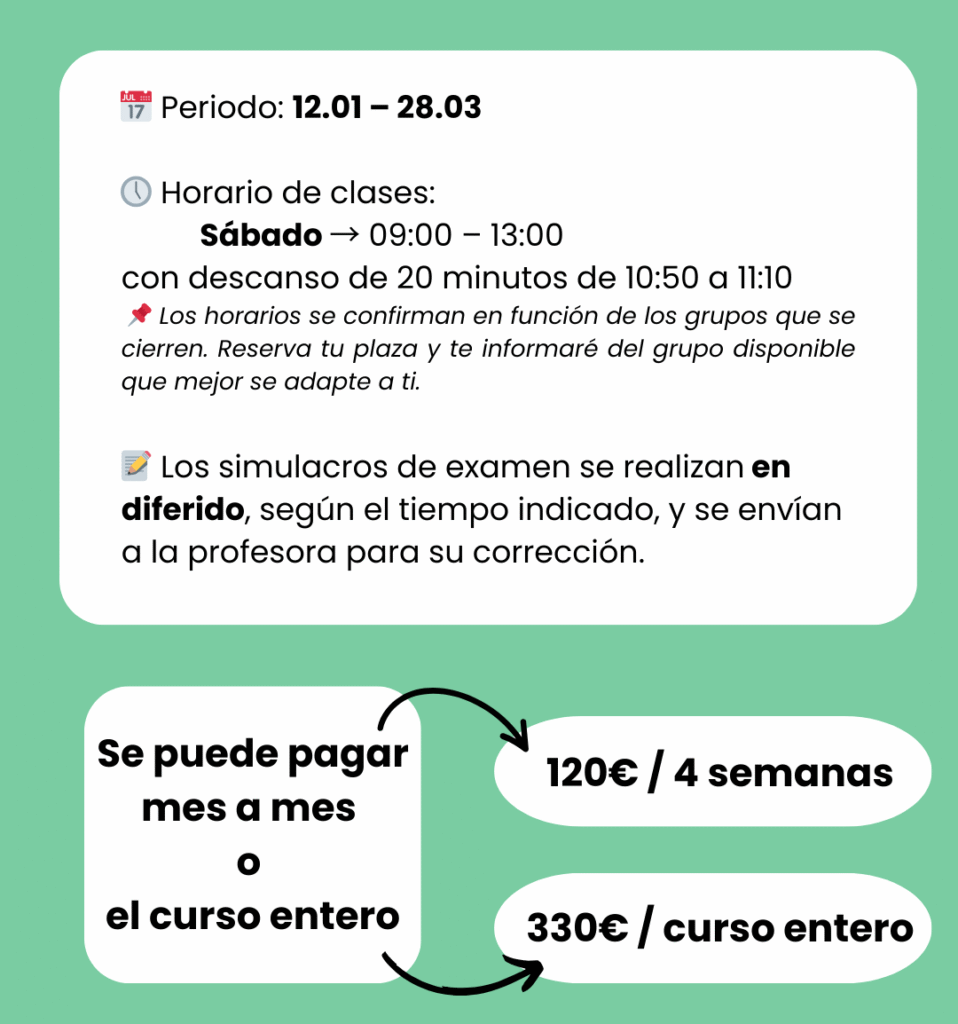 Si por estudios o trabajo NO puedes encontrar tiempo para asistir a clase durante la semana, prueba las clases del sábado por la mañana para seguir preparándote para el examen igualmente.